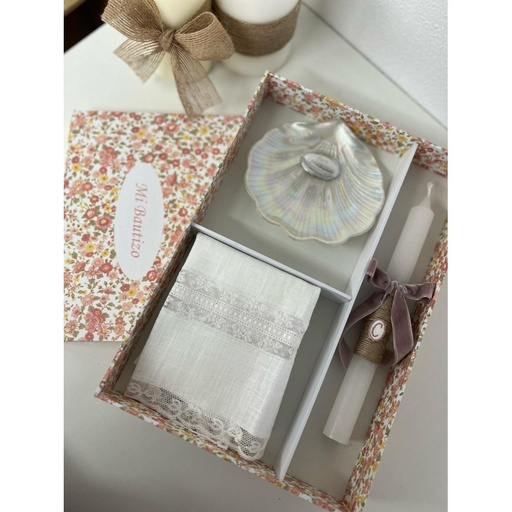 Kit Bautizo vela, toalla, concha y caja flor Paula